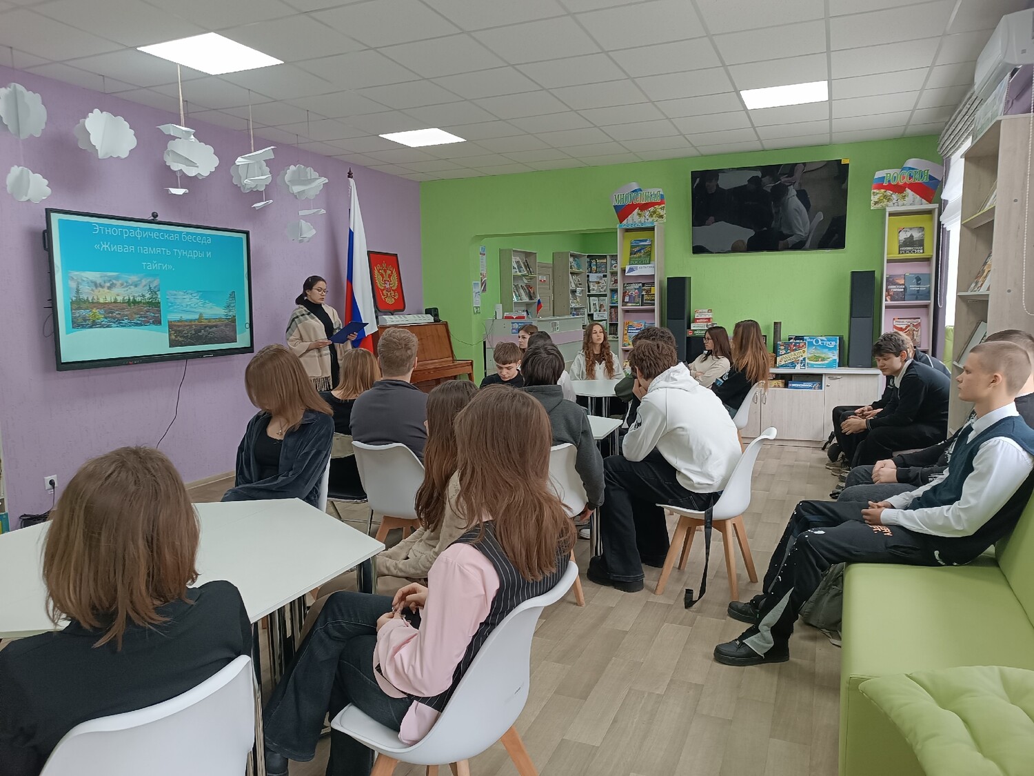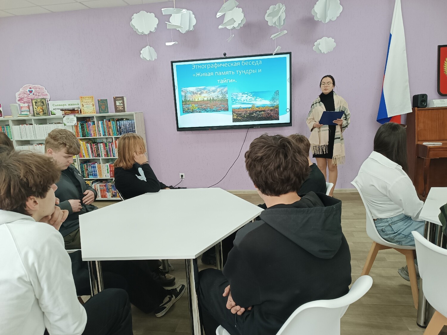 29 апреля в Центральной городской библиотеке прошло мероприятие, посвящённое Дню малочисленных народов России, этнографическая беседа «Живая память тундры и тайги». Ребятами прикоснулись к культуре и традициям народов, чья жизнь неразрывно связана с природой Сибири и Дальнего Востока. Библиотекарь открыла встречу рассказом о самобытности и мудрости малочисленных народов: ненцев, хантов, эвенков, чукчей, нанайцев и других. Особое внимание уделили тому, как их традиции, язык и искусство отражают уникальное видение мира и гармонию с окружающей средой. В ходе беседы ребята «путешествовали» по бескрайним просторам Сибири и Дальнего Востока. С помощью ярких визуальных материалов и видеороликов участники познакомились с особенностями жилищ – чумов и яранг, традиционной одежды с зашифрованными в орнаментах посланиями, а также с уникальными праздниками, такими как якутский Ысыах и День оленевода. Особое место заняли рассказы о кухне народов Севера, где каждое блюдо – это урок выживания и благодарности природе. Гости обсудили, как современные библиотеки становятся мостом между древними традициями и новыми поколениями, сохраняя уникальные тексты и истории. В интерактивной части мероприятия участники «читали» древние петроглифы, размышляли о значении символов и делились своими ассоциациями. Особое внимание уделили мысли о том, что библиотека – это не просто хранилище книг, а место встречи всех историй: от наскальных рисунков до современных изданий. В завершение встречи библиотекарь подчеркнула: культура малочисленных народов России – это живая традиция, которая учит уважению к природе, мудрости предков и ценности многообразия. Мероприятие оставило у ребят тёплые впечатления и желание глубже узнать о наследии народов тундры и тайги. | |