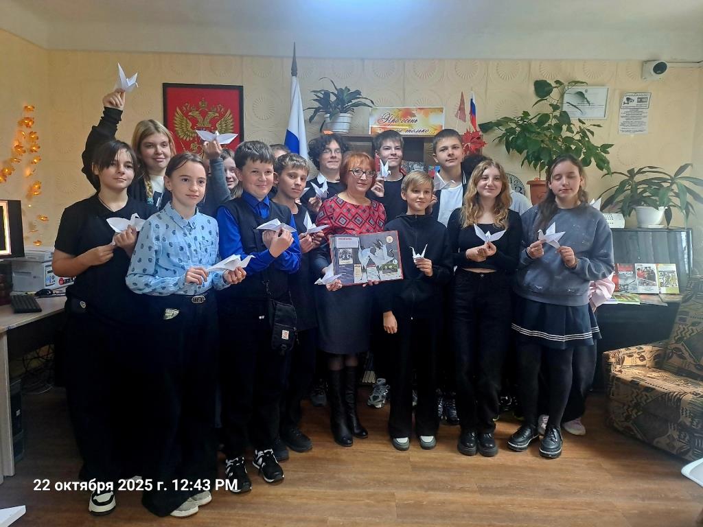22 октября в библиотеке-филиале №1 прошло очередное заседание историко-патриотического клуба «Время и мы», для старшеклассников ГБОУ ССШ №18 им. Болотова. Встреча была посвящена Дню белых журавлей. В начале встречи особое внимание ведущая обратила на историю возникновения этого праздника, его трогательности и значимости, истории судеб тысяч и тысяч, не в чем неповинных, погибших людей, ставших заложниками политических интриг и военных конфликтов… В России День Белых Журавлей был учреждён в 1986 году, как праздник духовности и светлой памяти павших на полях сражений во всех войнах и террористических актах, с предложения народного поэта Дагестана Расула Гамзатова. Но началась история о белых журавлях гораздо раньше – 6 августа 1945 года в 8 часов 14 минут с атомной бомбардировки японского города Хиросимы. Слушатели эмоционально восприняли рассказ библиотекаря о страшной ядерной трагедии, унёсшей в одну секунду жизни около 100000 человек, искалечившей жизни многих поколений местных жителей. И через десятки лет, эхом боли ужаса и смерти отзывается эта трагедия в современности. Она служит напоминанием о ценности и неповторимости каждой жизни, каждой мысли, каждого созидательного действия. В продолжении беседы жизнеописание японской девочки Садако стало ярким примером общей трагедии целого народа. Именно эта маленькая героиня до последнего боролась за свою жизнь, именно она непреклонно верила в волшебство мечты, которую можно исполнить, сделав из бумаги 1000 белых журавликов. До сих пор дети разных стран мира присылают тысячи журавликов в мемориал Мира в Хиросиме… У нас в стране страшной трагедией стала Великая Отечественная война и журавли стали символом памяти ушедших защитников, не исчезнувших в забвении, а вечно стоящих на защите нашей Родины, вечно живущих среди нас, подвиг которых останется в веках. В конце мероприятия ребята научились складывать из бумаги белых журавликов, стали в круг дружбы и сфотографировались на память. | |
